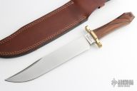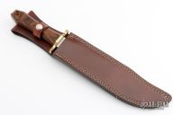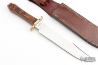 This Bowie by Gerber features a satin finished clip point blade with a nearly sharpened top edge, .291" blade stock and 1.486" blade depth, hidden tang construction. The handle has a brass guard and wood handle. Comes with brown leather sheath. "0637-1500 1991" on blade. Excellent condition.