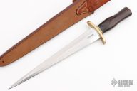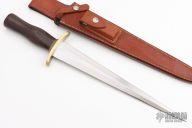 This Model 13-12 Arkansas Toothpick by Randall Made Knives features a satin finished carbon steel double edged blade with .205" blade stock and 1.585" blade depth, hidden tang construction. The handle has a forward curved brass guard, rosewood grip with a scalloped brass collar. Comes with a brown leather rough back sheath. Has a few light scratches, otherwise excellent condition.