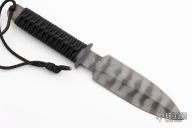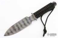 This Dagger by Strider Knives features a tiger striped double edged blade with .244" blade stock and 1.724" blade depth, full tang construction with a cord wrapped handle. Has some scuffs on the blade, otherwise the knife is in excellent condition.