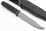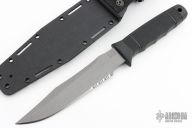 The Tigershark has a grey coated partially serrated blade with black zytel grip. Comes with a kydex sheath. Has a couple scuffs, otherwise excellent condition.