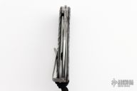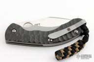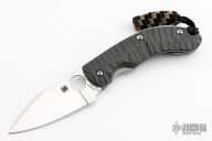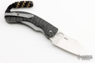 This Perrin PPT from Spyderco has a satin finished CPM S90V stainless steel drop point blade with thumb hole and notched thumb rest. Handle is carbon fiber over bead blasted stainless steel liners and backspacer. Bead blast stainless steel tip up clip. Excellent condition. Includes original box and papers.