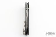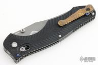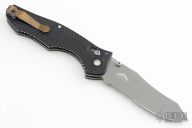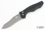 This Contego from Benchmade features a gray partially serrated blade. Black G-10 handle textured in the center and grooved on edges for a better grip. Carbide glass breaker on pommel. Perfect function and strong lock up. Excellent Condition. Comes with original box, screws and clip. Fitted with anodized titanium screws and a Lynch Fauxmascus clip. Discontinued.