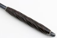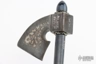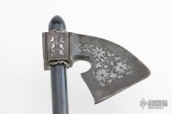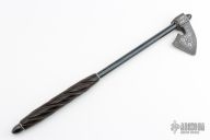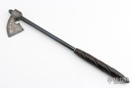 This Tomahawk by Todd Kopp features an antique axe head with inlaid silver engraving, .950" blade stock at the hammer pole, and 3.375" from blade to pole. The handle has a blued steel shaft and finials at the top and bottom of the handle, spiral fluted and silver wire inlaid dark wood grip. It is obvious that the head is an antique that has been rehandled. It is a really cool piece by Todd!