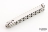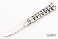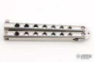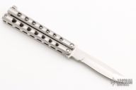 This balisong by 29 Knives features a satin finished blade. The handle is composed of satin finished integral stainless steel. Has scuffs and scratches, good condition otherwise.