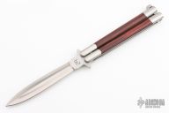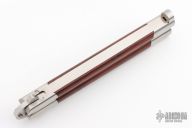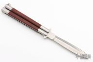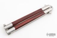 This balisong by 29 Knives features a satin finished blade. The handle is composed of satin finished integral stainless steel with purple wood inserts. Comes with a nylon Velcro pouch. Has some light scuffs and scratches, great condition otherwise.
