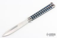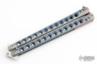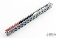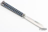 This Balisong by Charles Marlowe features a handrub satin finished drop point blade with sharpened top edge. The handles are heavy orange peel and anodize finish titanium and have a T-latch. Red G10 spacers and latch. Marked IKBS and BL06 on the blade. Comes with a zipper case. Has a couple light scuffs and scratches, excellent condition otherwise.