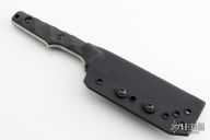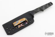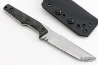 This Skraeling from Bawidamann Blades features a tumble finished tanto style blade with swedge, notched thumb rest and fileworked ricasso, .153" blade stock and 1.099" blade depth. The handle is comprised of sculpted IM Bawidamann Chunked Pattern Carbon Fiber scales (proprietary Carbon fiber composite) over full tang construction. Lanyard hole in pommel. Includes kydex sheath. Excellent condition.