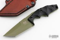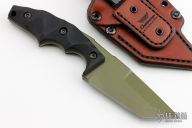 This POGN-L by Bawidamann Blades features a green Cerakoted blade with a false top edge, notched thumbrest and fileworked spine, .154" blade stock and 1.502" blade depth, full tang construction. The handle has black G-10 scales. Comes with a brown leather sheath by Chattanooga Leatherworks. Excellent condition.