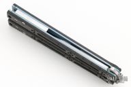 This Basilisk R from HOM Design features a two-tone finished recurved clip point blade with satin flats, tumbled bevels and swedge. The handle is comprised of carbon fiber scales over anodized titanium liners and stainless steel backspacers. Comes with nylon pouch. Has some scuffs and scratches great condition otherwise.