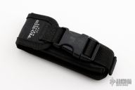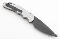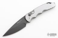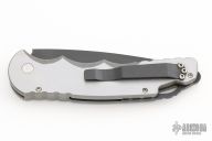 This TR-4 Steel Custom by Pro-Tech knives features a black spear point blade. The handle has a two-tone handle with satin flats and bead blasted edges with a black tip up clip and backspacer with lanyard hole. Black G10 inlay in push button, has safety. Comes with original box, sheath and papers. Has some oxidation on the frame. Great condition otherwise.