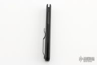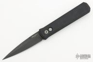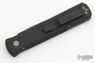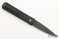 This Godfather features a black blade with notched thumbrest. The handle has a black aluminum frame with blasted hardware, bead blast finished push button and black stainless steel tip up clip. Has some light scuffs and scratches, great condition otherwise.