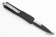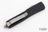 This Ultratech by Microtech Knives features a black bayonet ground blade with sharpened top edge. The handle has a black aluminum frame with bead blast hardware and tip down stainless steel clip, Dated 03/2015 and S/N 54023. Comes with original box. Excellent condition.