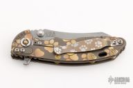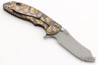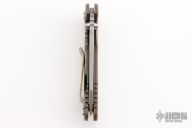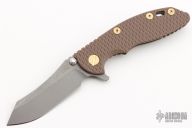 This XM-18 by Rick Hinderer features a working finished blade with notched thumbrest and flipper. The handle has a FDE G-10 front scale, battle bronze titanium frame with Chaos Dog Paw motif, brass hardware, and a tip up or down reversible titanium clip and filler tab, lanyard hole at the butt. Comes with original box and extra hardware. Excellent condition.