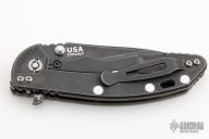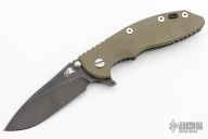 This XM-18 by Rick Hinderer features a battle black slicer blade with notched thumbrest and flipper. The handle has a battle black titanium frame, OD Green G-10 scale, and a tip up or down reversible finished titanium clip and filler tab, lanyard hole at the butt. Comes with original box and extra hardware. Excellent condition.