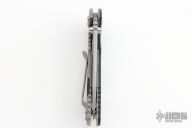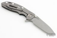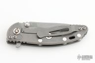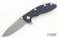 This XM-18 by Rick Hinderer features a working finished slicer blade with notched thumbrest and flipper. The handle has a working finished titanium frame, blue/black G-10 scale, satin titanium barrel spacers, and a tip up or down reversible titanium clip and filler tab, lanyard hole at the butt. Excellent condition. Comes with a Hinderer box.