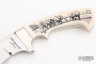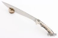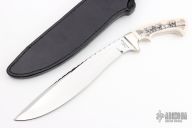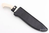 This Kukri from P. Sheehan features a mirror finished blade with fileworked spine, .184" blade stock and 2.014" blade depth, full tang construction. The handle is comprised of nickel silver bolsters, scrimshawed mammoth ivory scales, fileworked tang. Includes padded and zippered case and a black leather sheath. Has a couple light scratches, otherwise excellent condition.