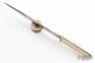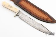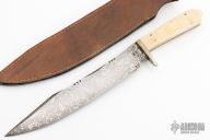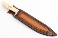 This knife features a forced patina finish with fileworked spine, .245" blade stock and 1.693" blade depth, full tapered tang construction. The handle has a nickel silver guard, bone scales with nickel silver pins and escutcheon. Comes with a hand tooled brown leather sheath and a zippered case. Excellent condition.