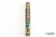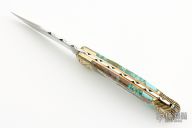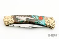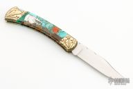 This Buck 110 has been Customized by Ghostown Knives. This one has a satin finished blade with fileworked spine and a nail nick. The handle has a brass frame with engraved flowers on the bolsters, fileworked edges and liners, fileworked stainless steel backspacer. The inlays are turquoise, brown/orange stone, jasper, and an engraved silver inlay of an alligator. Has a few light scratches, otherwise excellent condition. Comes with a copy of an article by Ronald Cline about Ghostown Knives