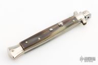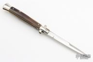 This 11" Picklock by Frank Beltrame features a polished bayonet ground blade with false top edge. The handle has nickel silver bolsters, front and rear, honey horn scales, brass liners, stainless spring. Has a couple light scratches, otherwise excellent condition.
