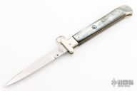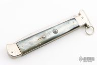 This 11" Ringpull Auto by AGA Campolin features a polished spear point blade. The handle has nickel silver bolsters, buffalo horn scales, brass liners and stainless steel backspacer. Has a nickel silver ring pull. Has a couple light scratches, otherwise excellent condition.  Dated 2015