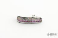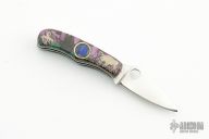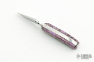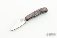 This Bug slipjoint from Spyderco has been customized by Ghostown. It has a satin finished clip point blade with a plain edge and thumb hole. Handle has stainless steel liners with stainless steel back spacer. The handle has custom purple, black, blue and brown stone with silver inlays of coyotes on one side and an indian on horseback and buffalo on the other side. Has a couple light scratches, otherwise excellent condition. Comes with a copy of an article by Ronald Cline about Ghostown Knives