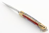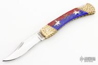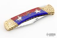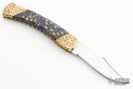 This Schrade LB7 has been Customized by Ghostown Knives. This one has a satin finished blade with fileworked spine and a nail nick. The handle has a brass frame with a knapped texture on the bolsters, fileworked edges and liners, fileworked stainless steel backspacer. The inlays are jasper and lapis, and engraved silver inlays of Indians on horseback. Has a few light scratches, otherwise excellent condition. Comes with a copy of an article by Ronald Cline about Ghostown Knives
