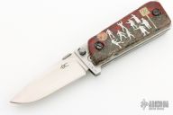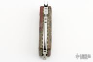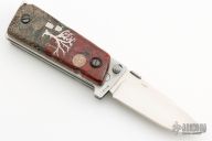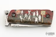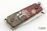 This knife by Ultimate Equipment features a satin finished blade with notched thumbrest and a thumbdisc. The handle has custom scales by Ghostown Knives. The theme is "Shootout at the OK Corrale" on one side and "The Hanging Tree and Tombstone Cemetary". Handles are red/brown/green stones with engraved silver inlays, paua shell moon inlay, brass inlaid hanging rope, brass OK sign. Amazing detail. Stainless steel frame. Comes with a copy of an article by Ronald Cline about Ghostown Knives. Has some light scratches, otherwise excellent condition.