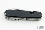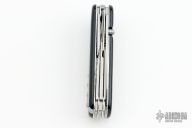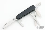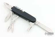 This knife features two tumbled blades, tools and scissors. The handle features black plastic scales over steel liners/backsprings. Includes tweezers and tooth picks. This knife has been customized by Daniel Holtz. Excellent Condition.