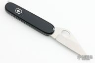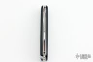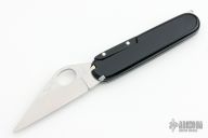 This knife features a tumbled finished wahrncliffe blade. The handle features black plastic scales over steel liners/backsprings. Includes tweezers and tooth picks. This knife has been customized by Daniel Holtz. Excellent Condition.