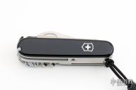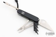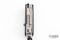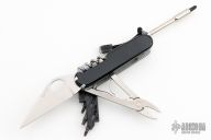This knife features tumbled blades, tools and pliers. The handle features black plastic scales over steel liners/backsprings. Includes tweezers and tooth picks. This knife has been customized by Daniel Holtz. Excellent Condition.