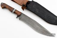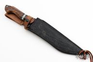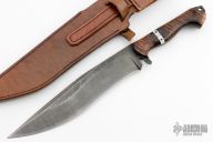 This Full Custom One-Off Hog Stabbing Knife by Half Face Blades features a dark tumble finish blade with a sharpened top edge and fileworked spine, .209" blade stock, 2" blade depth, full tang construction. The handle has knurly koa wood scales with white and black turquoise bands, black and natural canvas micarta pins, and brown canvas micarta liners. Comes with a buffalo hide leather sheath. Has some scratches and pataina, the consigner said he used it to kill 20-30 hogs, but as he ages, it is harder and harder to get into the brush with them. Good condition.