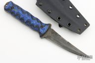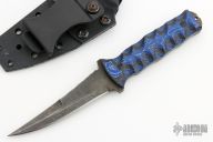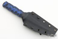 This Combat Fillet Knife by Half Face Blades features a dark tumble finished blade with false top edge, textured blade spine, .153" blade stock and 1" blade depth, full tang construction. The handle has blue twill/carbon fiber sculpted scales. Comes with kydex sheath with belt clip. Has some sheathing marks, otherwise excellent condition.