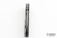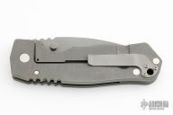 This Satu framelock folder from Grayman Knives features a spear point recurve bead blasted blade with dual thumb-studs and notched thumb-rest. The handle has a black G-10 scale with titanium liner, and a bead blasted titanium lock-side, black G-10 back-spacer, and tip up titanium clip. Great blade seating, detent and lock up. Has some scratches and scuffs, has been used and carried, otherwise good condition.