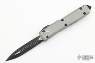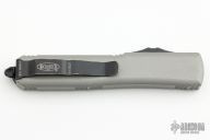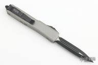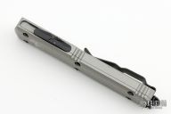 This Ultratech OTF automatic by Microtech Knives features a black D/E blade with a standard edge and a "Titanium Gray" aluminum handle. Black stainless steel clip and hardware. Glass breaker. S/N 200015 and dated 04/2021. Has come scuffs and scratches, otherwise good condition.