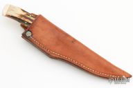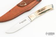 This Slim Line Hunter by Frank Centofante features a mirror polished blade with .119" blade stock and .875" blade depth, full tapered tang construction. The handle has nickel silver bolsters, front and rear, stag scales and nickel silver pins. Comes with a brown leather sheath and a zippered case. Excellent condition.