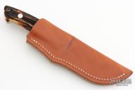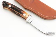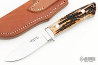 This Loveless Style Drop Hunter by SR Johnson features a mirror polished blade, .162" blade stock and .982" blade depth, full tapered tang construction. The handle has a stainless guard, stag scales and red liners. Comes with a brown leather sheath and a nylon zippered case. Excellent condition