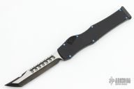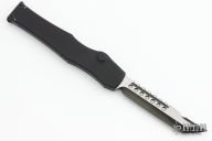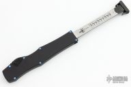 This Halo VI by Microtech Knives features a DLC Hellhound blade with satin flats and notched thumbrest. The handle has a black aluminum frame and titanium charging handle. No safety. Comes with the original zipper case. Dated 09/2018 and s/n 008. Has some light scuffs and scratches, excellent condition.