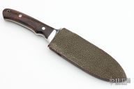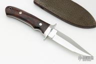 This Chute Knife by A. Desaulniers features a mirror polished blade with false top edge, .204" blade stock and 1.040" blade depth. The handle is comprised of a stainless steel guard, desert ironwood burl scales with red liners, full tapered tang construction. Lanyard tube in pommel. Includes a stingray skin sheath and zippered case. Excellent condition.