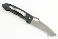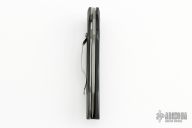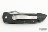 This Omeg by Allen Elishewitz features a bead blasted recurve blade with a thumbhole and a notched thumbramp.  The handle has black G10 scales over a single titanium liner.  Stainless steel tip down Benchmade pocket clip. Light scratches are visible on the pocket clip otherwise the knife is in excellent condition.