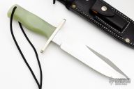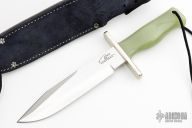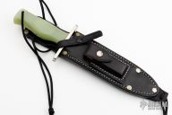 This Model 11A by Colin Cox features a mirror polished clip point blade with sharpened top edge, .249" blade stock and 1.482" blade depth, full tang construction. The handle has nickel silver guard and translucent jade G-10 with a lanyard hole. Comes with a Byrd's Leather black leather sheath with sharpening stone. Comes with zippered case. Has some verdigris on the guard, Excellent condition.