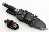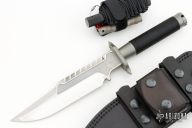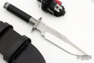 This Custom Interceptor by Marfione Custom Knives features a mirror finished blade with sharpened clip point and sawteeth on blade spine, .250" blade stock and 1.687" blade depth, hidden tang construction. The handle, guard and butt are bead blast finished titanium with black Microcord wrap on the grip. Has compass inside butt cap and storage space inside handle. Comes with a survival kit that includes waterproof pill capsule, magnesium bar, fire steel, small saw, Timberline utility knife, and a small ruler, is all wrapped in black microcord. Comes with a black leather sheath with belt loop. Excellent condition.