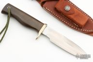 This Combat Companion by Randall Made Knives features a satin finished blade with sharpened top edge and notched thumbrest, .171" blade stock and 1.128" blade depth, full tang construction. Green linen micarta handle and nickel silver single guard, lanyard hole at the butt. The Combat Companion is one of Randall's non-catalog knives. Includes a brown leather sheath and a zippered case. Excellent condition.