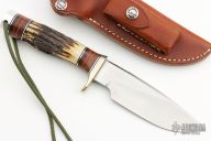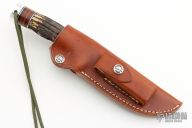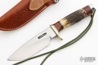 The Model 25-5 by Randall Made Knives is a drop point hunter similar to Model 11, but handle construction is reminiscent of 1930′s design. Excellent skinning, outdoors knife. This knife has a stainless steel blade with notched thumbrest, .209" blade stock and 1.385" blade depth, hidden tang construction. The handle nickel guard and duralumin pommel, stag grip with stacked leather, black and duralumin spacers. Comes with brown leather sheath and a Randall zippered case. Excellent condition.