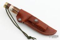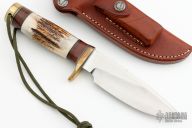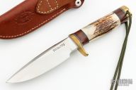 The Model 25-5 by Randall Made Knives is a drop point hunter similar to Model 11, but handle construction is reminiscent of 1930′s design. Excellent skinning, outdoors knife. This knife has a carbon steel blade with notched thumbrest, .193" blade stock and 1.366" blade depth, hidden tang construction. The handle brass guard and pommel, stag grip with stacked leather, black and brass spacers. Comes with brown leather sheath and a Randall zippered case. Excellent condition.