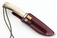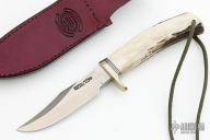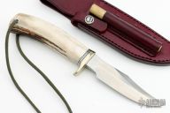 This Stanaback Special from Randall Made Knives features a satin finished clip point blade with sharpened top edge and notched thumbrest, .219" blade stock and 1.102" blade depth, hidden tang construction. The handle has a nickel silver guard with black and duralumin spacers and a slab side stag grip with a lanyard hole in the butt. Includes a maroon leather sheath with belt loop and a Randall zippered case. Excellent condition.
