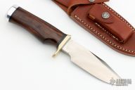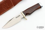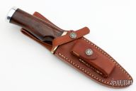 This Sergeant's Special by Randall Made Knife features a satin finished blade with sharpened top edge and a notched thumbrest, .210" blade stock and 1.313" blade depth, hidden tang construction. The handle has a nickel silver guard, ironwood grip with black spacers and a duralumin butt. Comes with a brown leather sheath and a Randall zippered case. Excellent condition.
