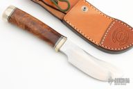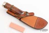 This Rick Bowles skinner by Randall has a satin finished blade with false top edge, .236" blade stock and 1.578" blade depth, notched thumbrest, hidden tang construction. The knife carries the small Randall logo stamp and the backside is etched with "Bowles Skinner 313". The handle has a nickel silver reduced hilt, ironwood burl grip, duralumin butt, and black/duralumin spacers. Comes with brown leather sheath signed/dated on back by Rick 2012. Excellent condition. Comes with a Randall Knives zippered case, original papers and sharpening stone.