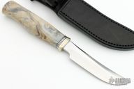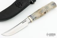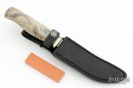 This Model 4-4.5 by Randall Made Knives features a satin finished blade with false top edge and notched thumbrest, .157" blade thickness and .924" blade depth, hidden tang construction. The handle has a nickel silver reduced hilt, buckeye burl wood grip with black/duralumin spacers. Comes with a black leather sheath and a Randall zippered case.  Excellent Condition.