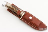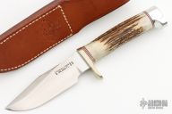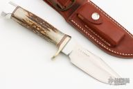 This Model 23 "Gamemaster" by Randall Made Knives features a satin finished clip point blade with sharpened top edge and a notched thumbrest, .213" blade stock and 1.319" blade depth hidden tang construction. The handle has a nickel silver guard and duralumin butt with a stag grip with red/white/blue spacers. Comes with a brown leather sheath and a Randall zippered case. Excellent condition. Says "P.C. Stanley" on the blade.