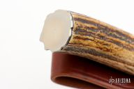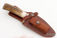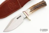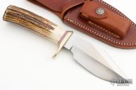 This knife has a satin finished stainless steel blade, with sharpened top edge and a notched thumbrest, .224" blade stock and 1.754" depth, hidden tang construction. The handle has nickel silver guard, stag grip with red/white/blue spacers, and a nickel silver butt plate. Comes with brown leather sheath and a Randall zippered case. Excellent condition.